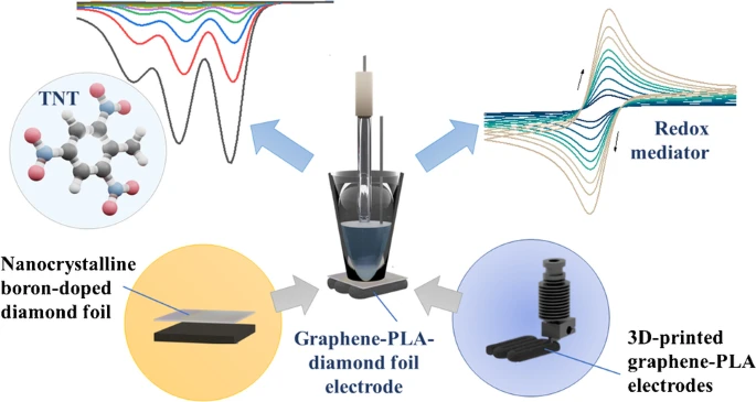 Conductive printable electrodes tuned by boron-doped nanodiamond foil additives for nitroexplosive detection.