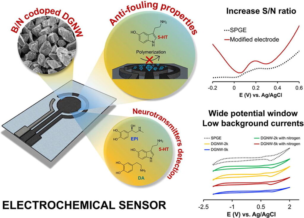 Electrochemical determination of neurotransmitter serotonin using boron/nitrogen co-doped diamond-graphene nanowall-structured particles.